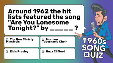 In this fun trivia quiz we're going to ask questions like "Around 1962 the hit lists featured the song "Are You Lonesome Tonight?" by _____ ?" and "Around 1961 the hit lists featured the song "Cathy's Clown" by _____ ?".