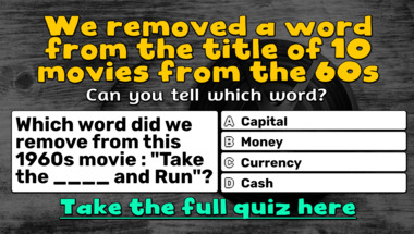 8/10 is the score to beat in this trivia quiz to put yourself over the average quiz taker. But you're probably going to be able to answer questions "Which word did we remove from this 1960s movie : "The ____ Dozen"?" and "Which word did we remove from this 1960s movie : "____ Upon a Time in the West"?" easy!