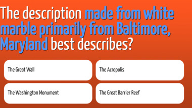 6/10 is what people on average are scoring in this Geography quiz so far. Are you ready to answer questions like "If you are in the city of Cork, where are you?" and "The description "made from white marble primarily from Baltimore, Maryland" best desc.."