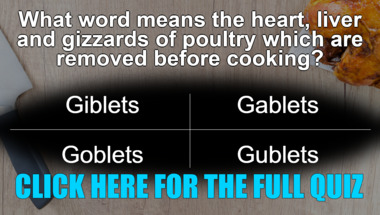 Look forward to questions like "What is the name of the freshwater shellfish related to a lobster?" and "What word means the heart, liver and gizzards of poultry which are removed before coo.."