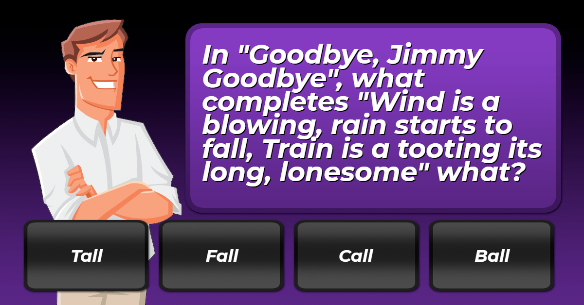 In "Goodbye, Jimmy Goodbye", what completes "Wind is a blowing, rain starts to fall, Train is a tooting its long, lonesome" what?