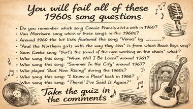 Look forward to questions like "Sam Cooke sang "that's the sound of the men working on the chain" what?" and "Do you remember which song Connie Francis had a hit with in 1960?"