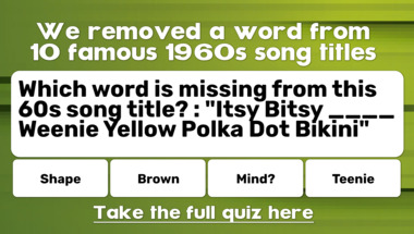 8/10 is what people on average are scoring in this 60s songs with missing words quiz so far. Are you ready to answer questions like "Which word is missing from this 60s song title? : "Itsy Bitsy ____ Weenie Yellow Polk.." and "Which word is missing from this 60s song title? : "You've Lost That Lovin' ____""