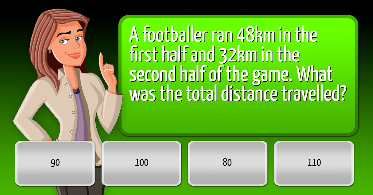 A footballer ran 48km in the first half and 32km in the second half of the game. What was the total distance travelled?